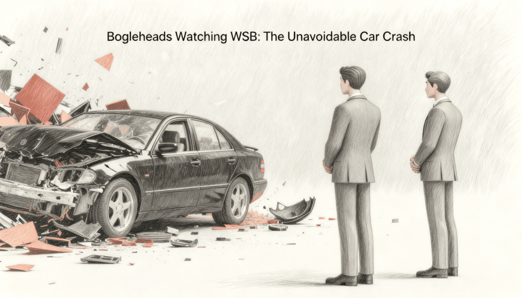 The traffic slows down near the crash. Everyone looks. Everyone tells themselves they are just being cautious. Nobody admits they are curious. That is the Boglehead on WSB at eleven at night, telling themselves one more scroll and then bed. Just one more loss porn post. Just one more account blown up. Just to confirm the road is still the safer choice.