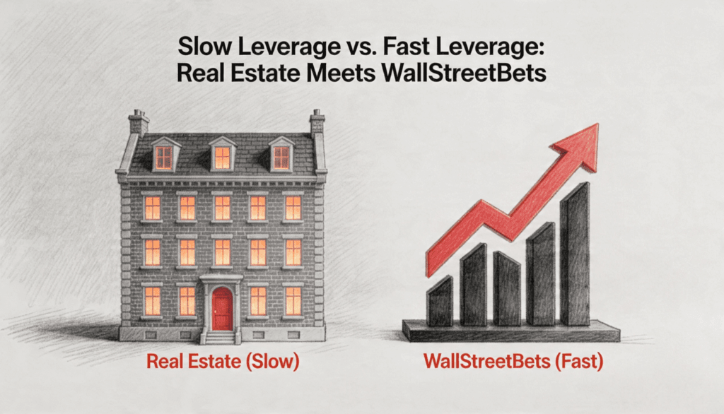 The real estate investor borrows from a bank, buys a property, and waits. The WallStreetBets trader borrows from a brokerage, buys options, and refreshes. Same principle. Wildly different vibes. One community celebrates patience, cash flow, and getting a good deal on a duplex. The other celebrates screenshots of six figure gains made during a lunch break. And yet the underlying mechanics are closer than either side would ever want to admit.