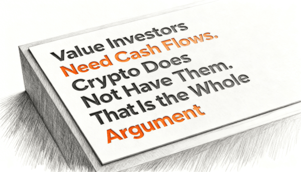 But notice what has happened in the conversation. The value investor asked a specific question, which was “where do the cash flows come from,” and the crypto believer answered a different question, which was “why is this thing valuable anyway.” Those are not the same question. Pretending they are is how the argument goes on forever.